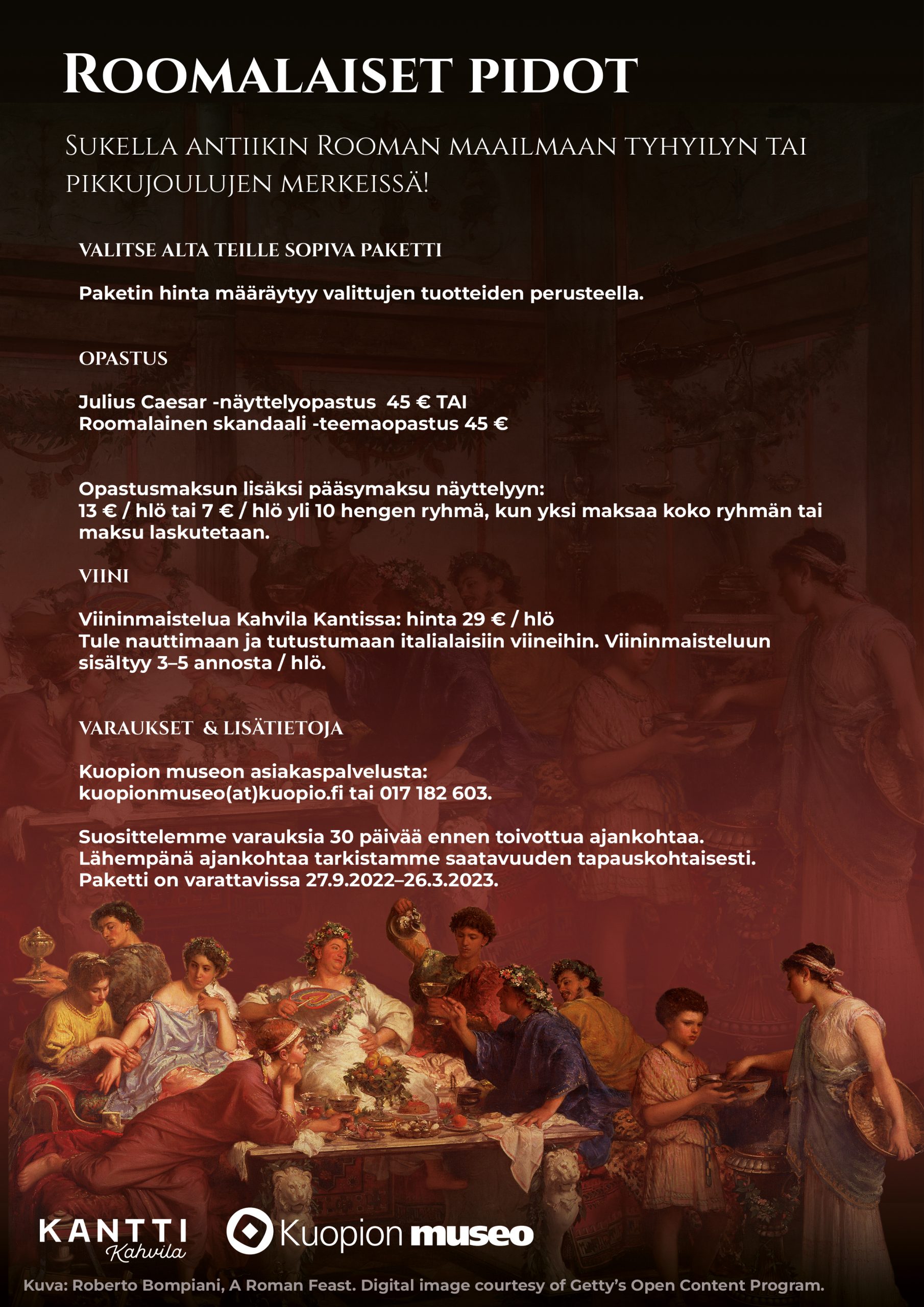 Sukella antiikin Rooman maailmaan tyhyilyn tai pikkujoulujen merkeissä! Roomalaisissa pidoissa tutustutaan museon näyttelyyn ja sen päähenkilöön Julius Caesariin sekä maistellaan italialaisia viinejä oppaan kertoillessa antiikin aikaisista juomista ja juhlakulttuurista. Paketin hinta määräytyy valittujen tuotteiden perusteella. Roomalaiset pidot voidaan järjestää, kun osallistujia on vähintään 5 ja enintään 20 henkilöä.